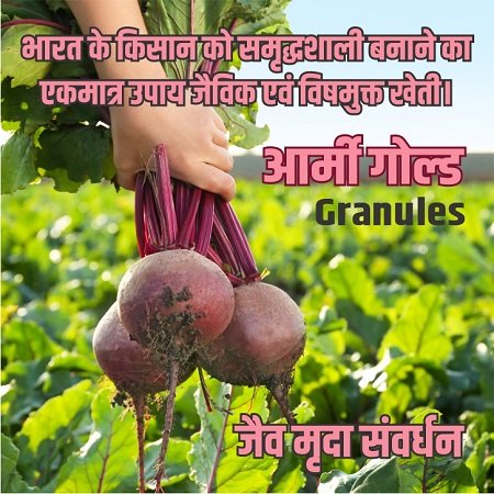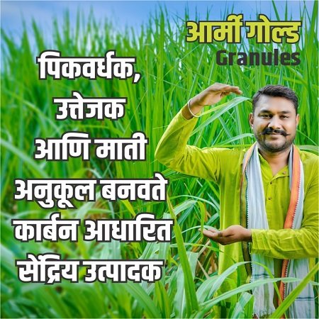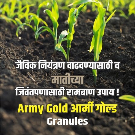 सेंद्रिय कर्ब वाढविण्याचा रामबाण उपाय आपल्या शेतीतून शाश्वत उत्पादन मिळवायचे असेल तर जमिनीचे आरोग्य जपणे आवश्यक आहे. सुपीकता उत्तम ठेवण्यासाठी सर्वांत महत्त्वाची बाब म्हणजे जमिनीतील सेंद्रिय कर्बाचे प्रमाण. सेंद्रिय कर्ब हा शाश्वत शेतीचा गाभा आहे.आर्मी गोल्ड मध्ये ह्युमिक ऍसिड आणि अमिनो ऍसिड असल्याने पिकांना उपयुक्त प्रोटीन उपलब्ध होते आणि ह्युमिक ऍसिड मुळे फायदेकारक जिवाणूंची संख्या वाढण्यास मदत होते. आर्मी गोल्ड प्लस ग्रॅन्युलर वापरल्याने सेंद्रिय कर्बामध्ये वाढ करता येते. सेंद्रिय कर्ब जास्त असलेल्या जमिनीत उपयुक्त जिवाणूंची संख्या अधिक असते. परिणामी पिकांना अन्नद्रव्यांची उपलब्धता अधिक होते.आर्मी गोल्ड प्लस ग्रॅन्युलर जमिनीत उपयुक्त जिवाणूंची संख्या वाढवते. जमिनीची भौतिक सुपीकताही लक्षणीय प्रमाणात सुधारते. जमिनीची जलधारणाशक्ती, पोत सुधारतो, त्यामुळे क्षारांचा निचरा होण्यास मदत होते. जमिनीत हवा खेळती राहिल्याने मुळांची निरोगी, जोमदार वाढ होते. आर्मी गोल्ड प्लस ग्रॅन्युलर हे संशोधन आधारित उत्पादन म्हणून विश्वसनीय आहे जे पर्यावरणासाठी सोपे-प्रभावी आणि सुरक्षित आहे.