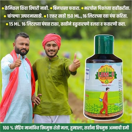 LOM-C Super Organic वापरण्याची पद्धत : LOM-C Super Organic बॉटल चे 1 झाकण 7.5 ML. चे माप आहे, 2 झाकण 15 ML. चे माप आहे, एका 15 लिटरच्या पंपामध्ये 2 झाकण टाकून 11 वेळेस काठीने हळुवार चांगले हलवा व स्प्रे करा. (अगोदर पंप दोन वेळेस धुणे व सुकल्यानंतरच वापरणे ) LOM-C Super Organic सर्व प्रकारच्या पिकांवर वापर करता येतो.